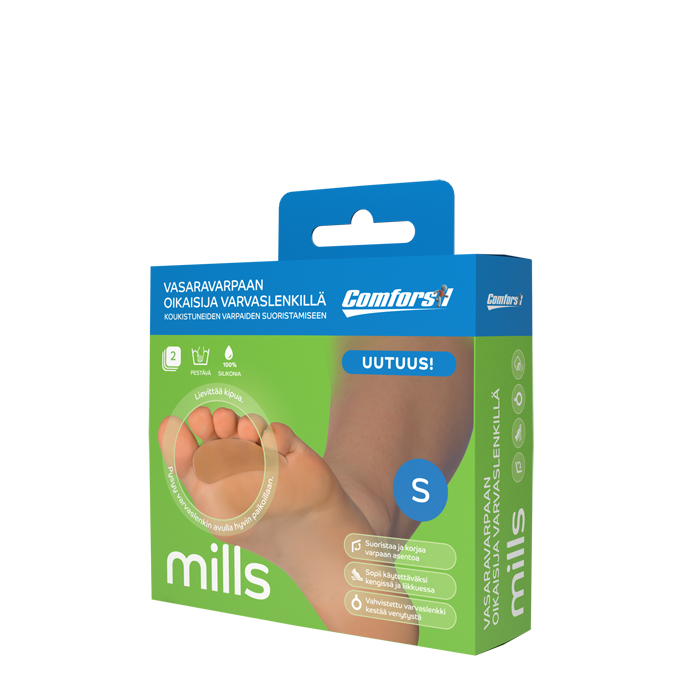 Suoristaa koukussa olevien varpaiden asentoa oikeaan asentoon. Vähentää painetta varpaiden päissä ja venyttää varpaiden alapuolista jännettä. Lievittää kipua myös jäykistyneissä varpaissa. Vahvistettu lenkki pujotetaan ongelmallisimman varpaan ympärille (2. tai 3. varvas). Oikaisija on oikeankokoinen, kun se ulottuu 2.- 4. varpaan alle. Pakkaus sisältää vasaravarpaan oikaisijan oikealle ja vasemmalle jalalle. Tuotteen yhteydessä suositellaan talkin käyttöä.